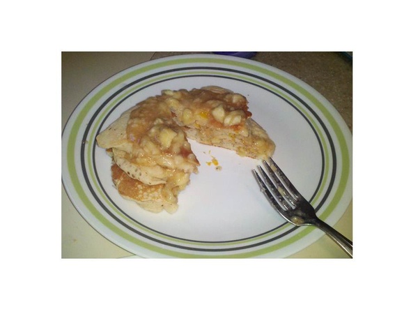 Then I mashed a banana into a bowl and added syrup. Yes, that simple. I poured it all over son's pancakes and he ate them up.